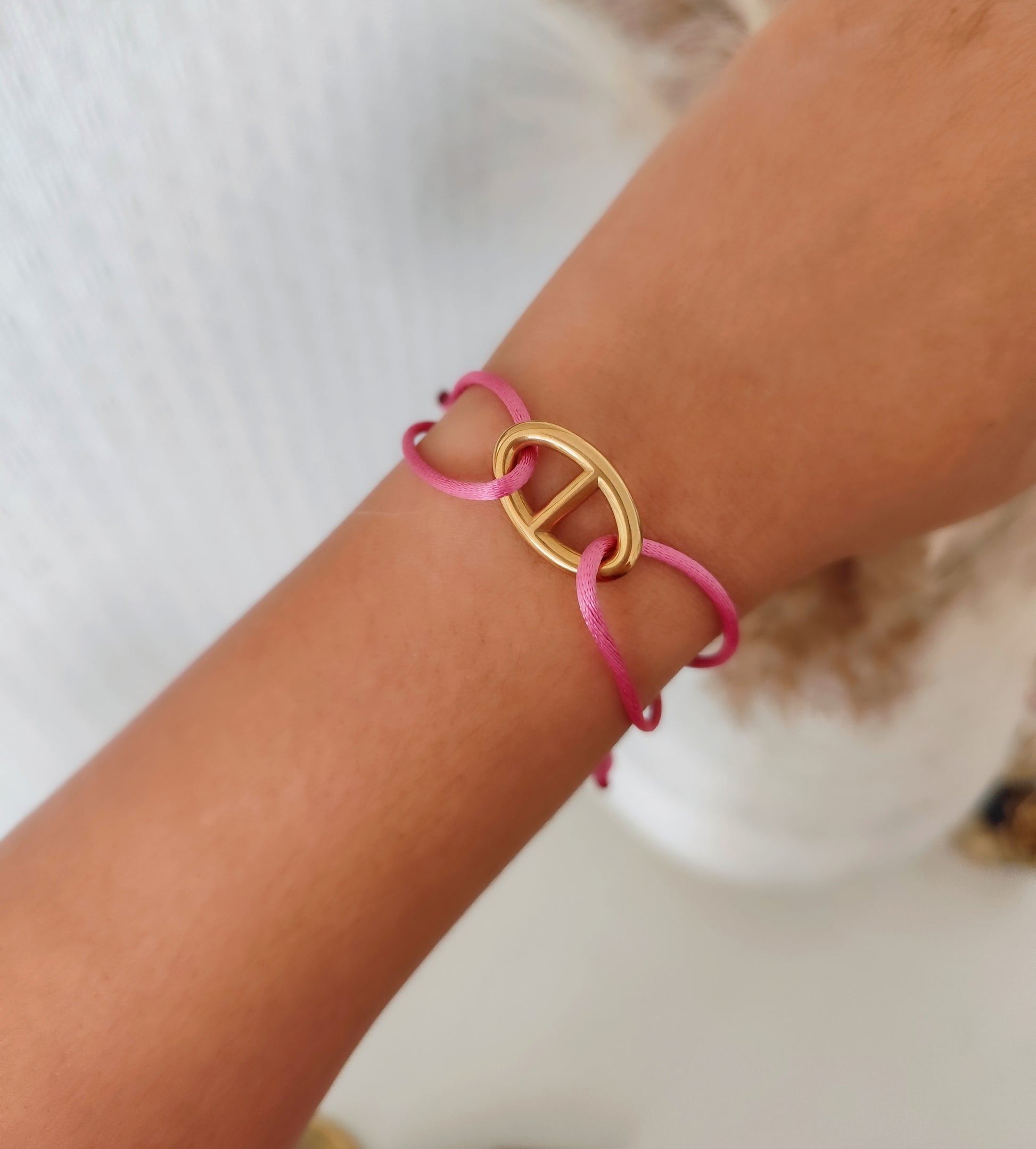 Son cordon satiné coloré met en valeur un maillon doré central, symbole de lien et d’élégance.