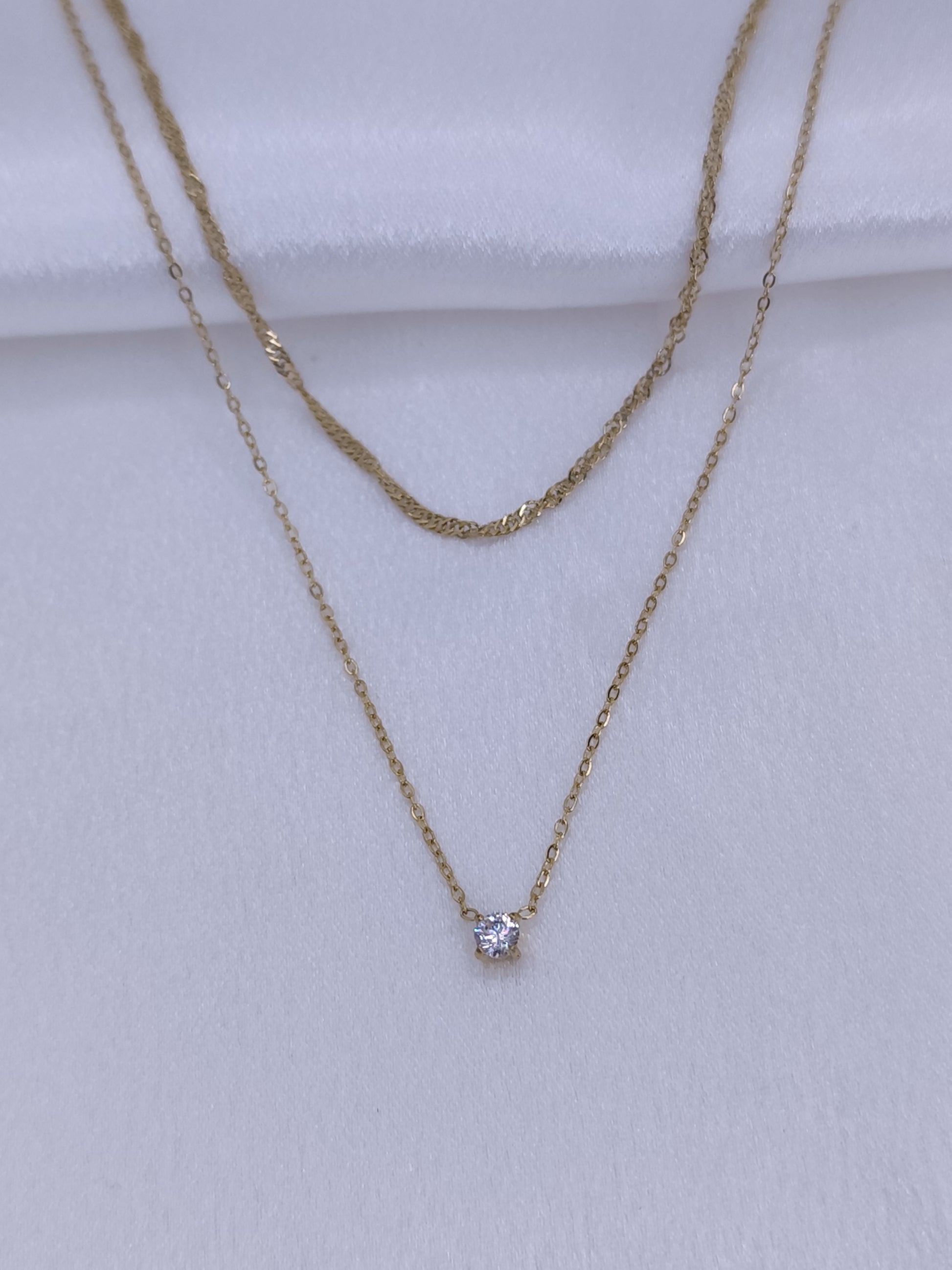 Un collier délicat et tendance composé de deux chaînes dorées superposées, mises en valeur par un zircon lumineux.