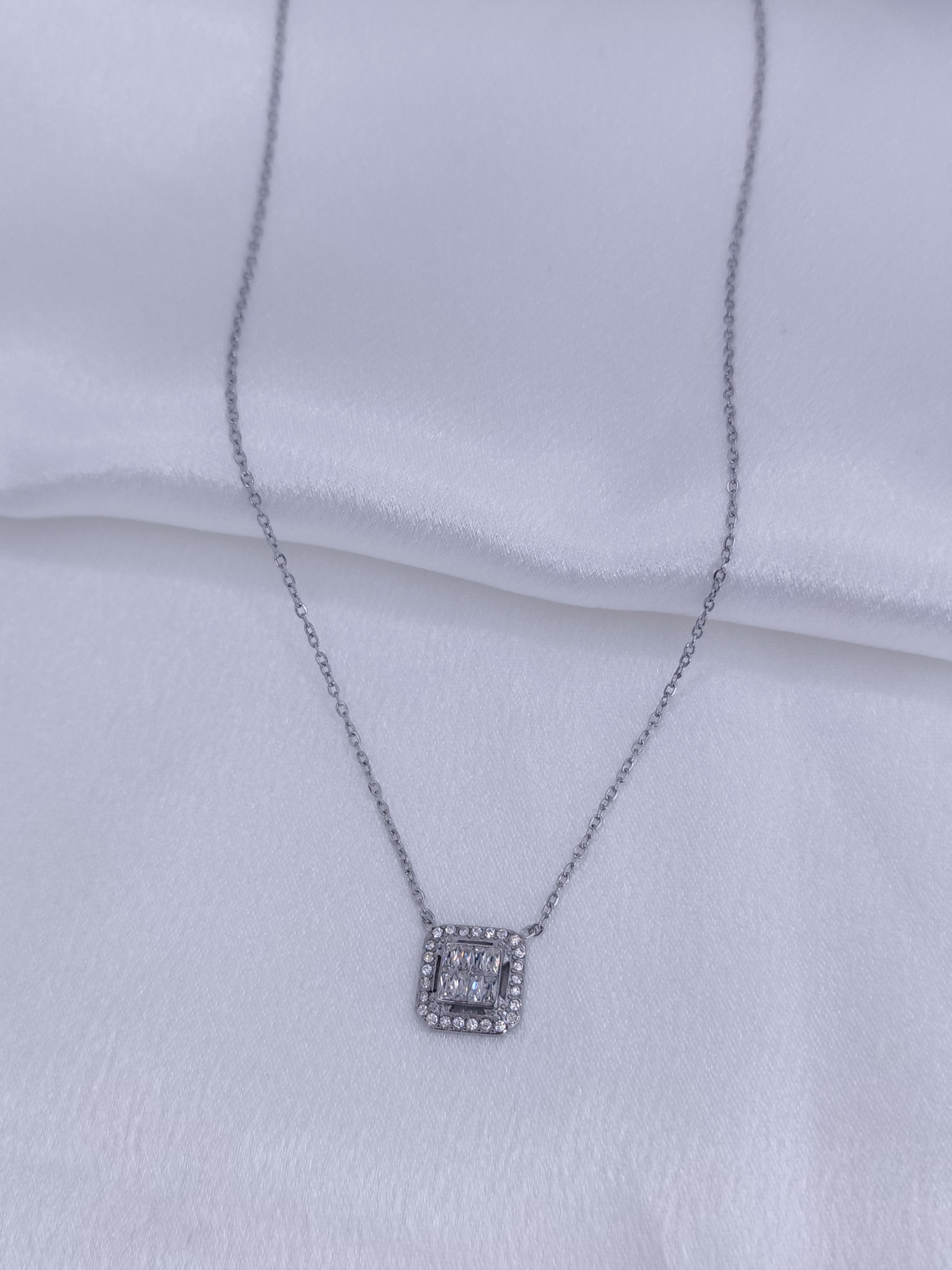 Le Collier Néora se distingue par son pendentif carré sublimé d’un zircon central lumineux entouré d’un halo d’éclats délicats.