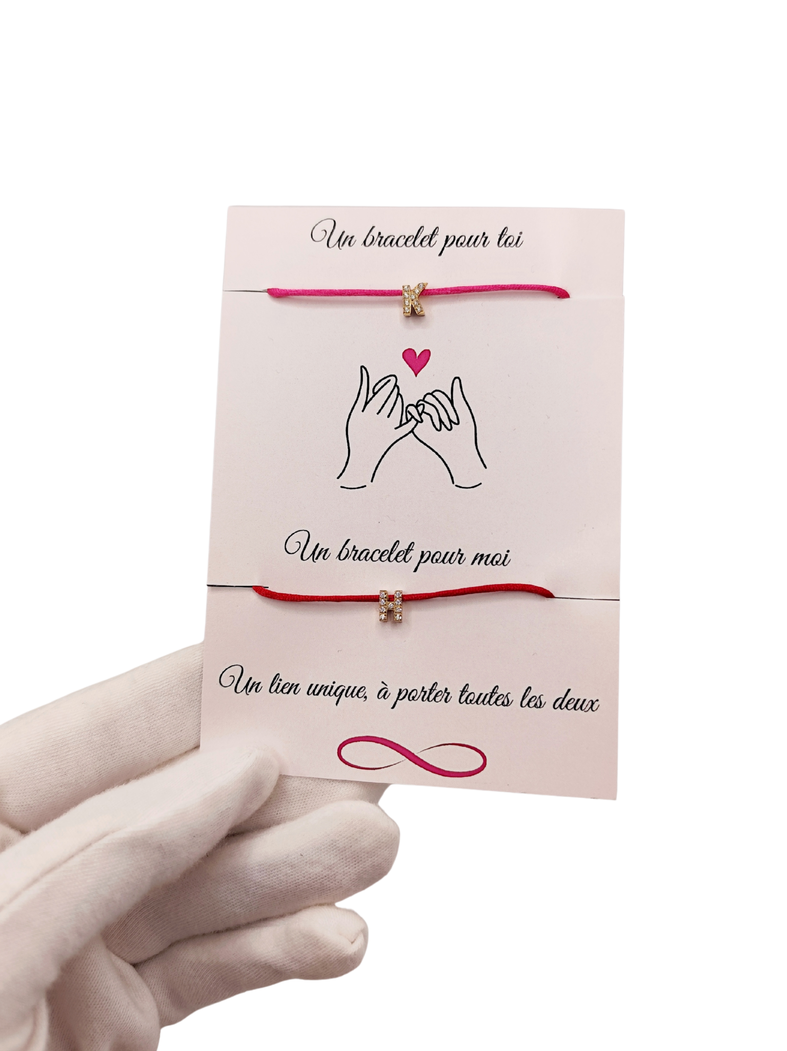 ✨ Personnalisation : chaque bracelet porte l’initiale de votre choix, monté sur un fil coloré ajustable, accompagné d’une carte illustrée pleine de tendresse.